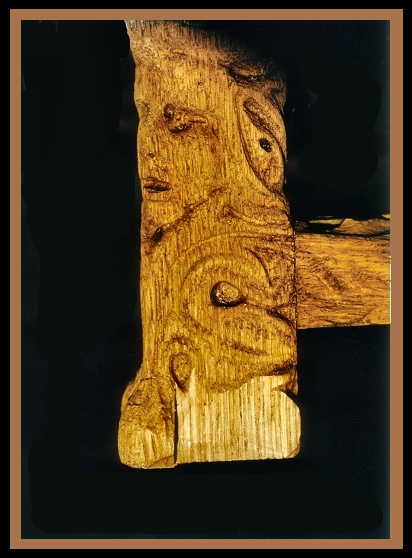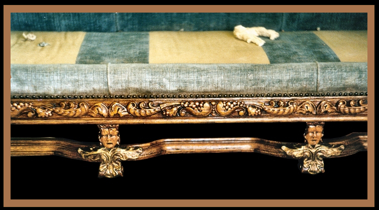According to the owner, this sofa resided in Dr. J. H. Kellogg's summer cottage on Gull Lake in Michigan. The piece had been antiqued with an amateurish, white enamel finish at some point in its history and that is how it arrived at Hander Woodworking. At the request of the owner, the paint was carefully removed, uncovering residue from its original finish. This provided a definite direction for its restoration when both gold and copper leafing were discovered on various carvings including clues to the wood's original color. Oddly, no gesso or plaster had been used to fill the heavy oak grain so the restoration followed suit.